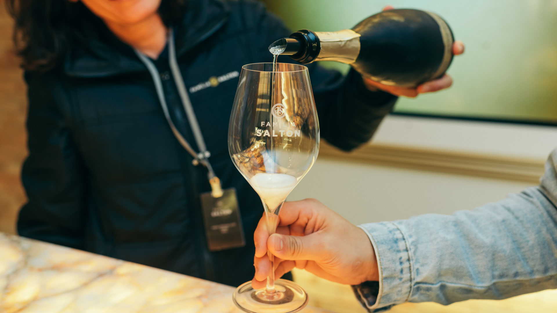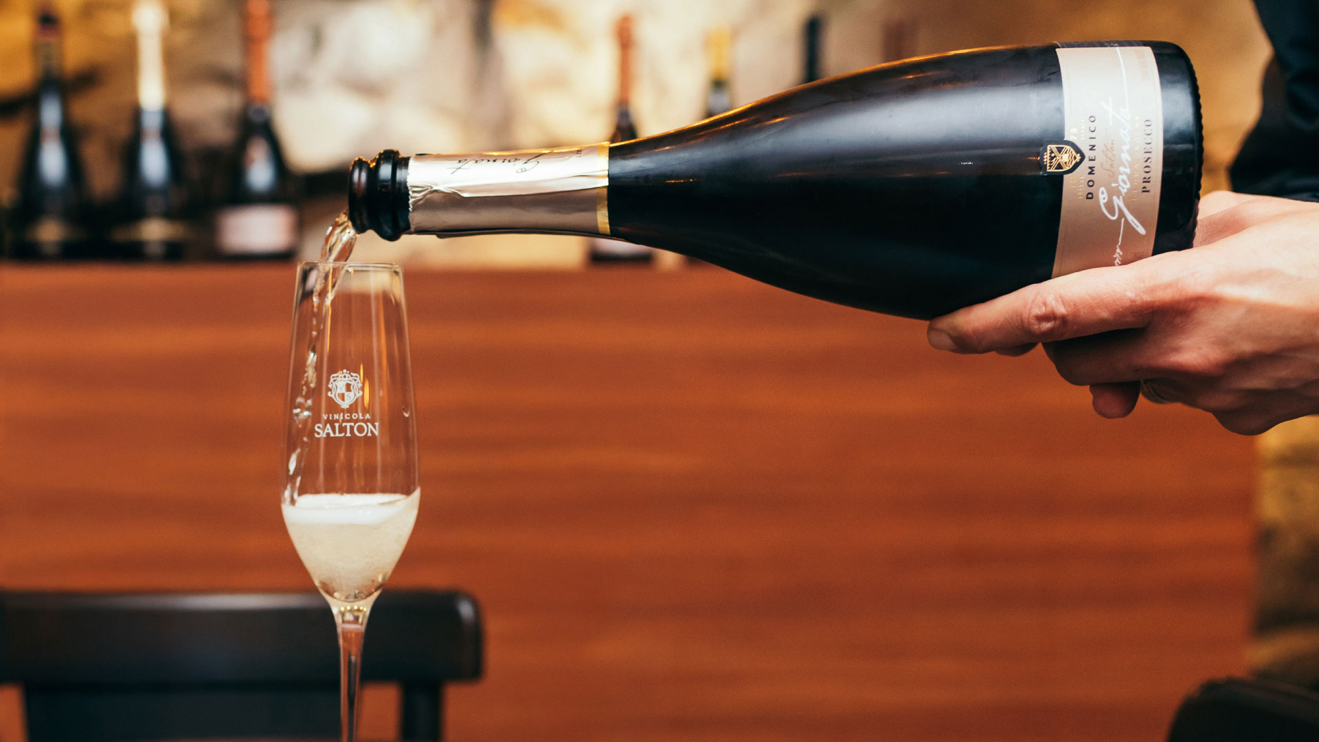 - Incline levemente a taça, despejando o espumante pela lateral, suavemente. Isso evita a formação excessiva de espuma e preserva o perlage;
